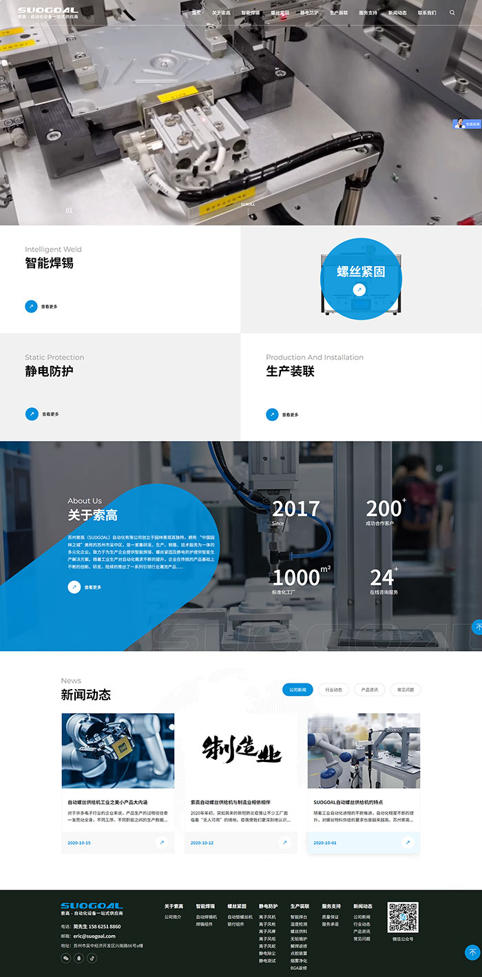 蘇州索高(SUOGOAL)自動化有限公司創立于園林景觀其獨特,擁有 “中國園林之城”美稱的蘇州市吳中區,是一家集研發、生產、銷售、技術服務為一體的多元化企業。致力于為生產企業提供智能焊接、螺絲緊固及靜電防護提供智能生產解決方案。隨著工業生產對自動化需求不斷的提升,企業在傳統的產品基礎上不斷的創新、研發,陸續的推出了一系列引導行業潮流產品。