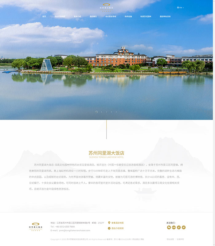 蘇州同里湖大飯店-深具文化園林特色的臺資五星級酒店,被評選為《中國十佳最受歡迎旅游度假酒店》,坐落于蘇州市吳江區同里鎮,擁抱美麗的同里湖而筑。離上海虹橋機場僅一小時車程,步行10分鐘即可走入千年同里古鎮。整體面積廣達十萬平方米,完整的湖畔生態與精致的中式庭園,以及細膩的臺式服務,為世界各地游客所贊譽。館藏豐富的文物,被譽為可居可游的博物館。共計460間的客房、設有中、西、日式餐廳、十多處會議宴會場地,可同時容納上千人,豪華的各項室內室外活動設施,可滿足各式需求。酒店多次贏得江南文化住宿相關獎項,且被評選為金葉級綠色旅游飯店。